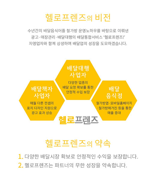 배달 통합서비스 ‘헬로프렌즈’를 운영해온 헬로월드가 전국 대리점 사업자들을 모집하는 사업설명회를 24일 개최한다. 헬로프렌즈는 주문 관리 프로그램인 ‘스토어프렌즈’와 배달 대행 서비스인 ‘배달프렌즈’를 주요 서비스로 하며, ‘철가방앱’과 ‘철가방 매거진’(배달 쿠폰북)을 통해 광고 대행까지 한 번에 해결해 주는 배달 음식점 통합 서비스이다.