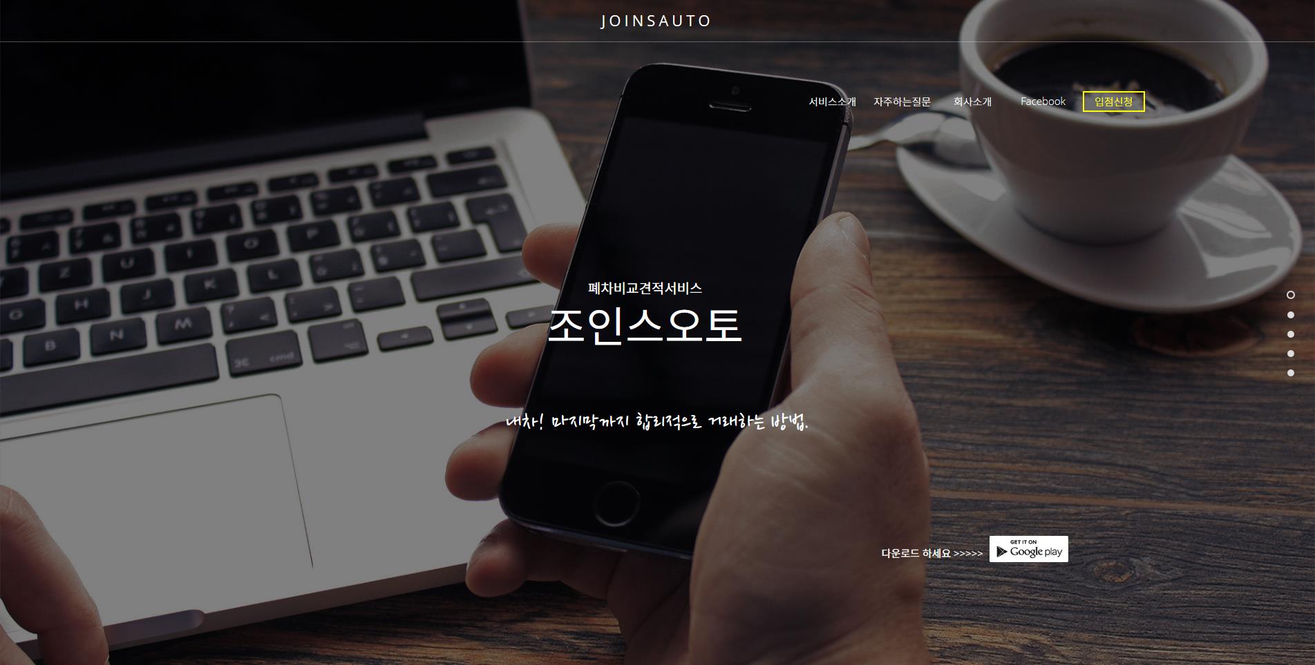 조인스오토는 15년 3월 출시된 O2O 폐차 비교견적 서비스로 현재 보유 이용회원 수가 10,000명을 넘어섰고 서울, 경기, 인천 등 수도권 지역과 광역시 중심에서 점차 시,군,구로 서비스를 확대 운영해 나가고 있다.