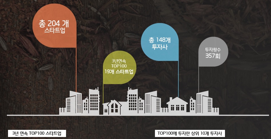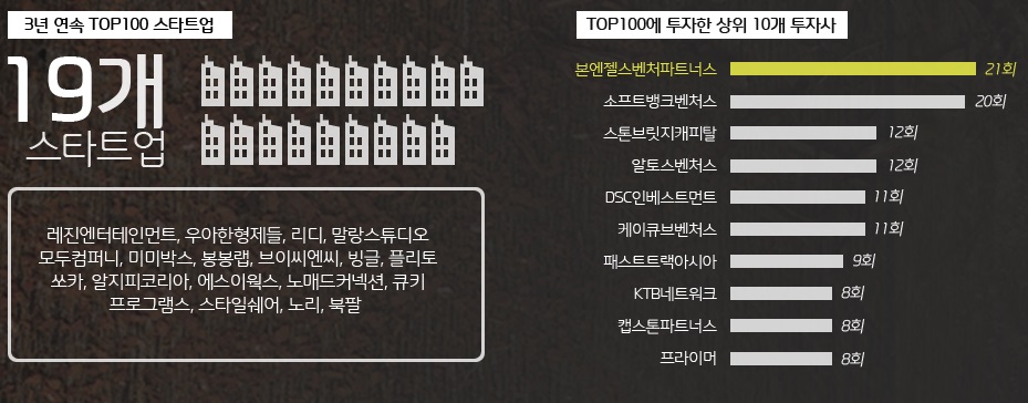 3년 연속 선정된 Top 스타트업은 총 19개사로 레진엔터테인먼트, 우아한형제들, 리디, 말랑스튜디오, 모두컴퍼니, 미미박스, 봉봉랩, 브이씨엔씨, 빙글, 플리토, 쏘카, 알지피코리아, 에스이웍스, 노매드커넥션, 큐키, 프로그램스, 스타일쉐어, 노리, 북팔이 선정됐다. 이들에게 투자한 투자사의 상위 10개 기업은 순위대로 본엔젤스벤처파트너스(21회), 소프트뱅크벤처스(20회), 스톤브릿지캐피탈(12회), 알토스벤처스(12회), DSC인베스트먼트(11회), 케이큐브벤처스(11회), 패스트트랙아시아(9회), KTB네트워크(8회), 캡스톤파트너스(8회), 프라이머(8회)로 나타났다.