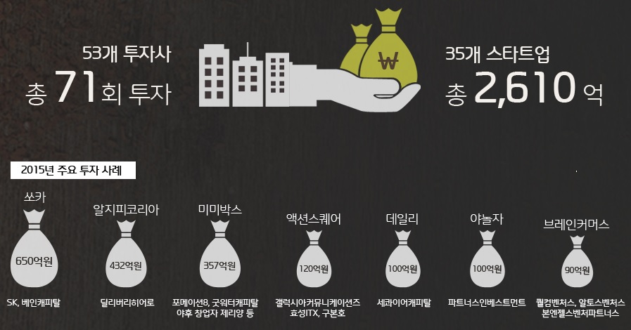 또한, 2015년 스타트업의 업종 변화에 대해서도 분석했다. 핀테크의 부상 그리고 게임의 침체로 정리되며, O2O는 재작년에 이어 지속적으로 강세를 보이고 있다고 한다. 신규 진입 산업으로는 MCN과 로봇 관련 스타트업으로 조사됐으며,주요 Exit 사례로는 ‘2014 스타트업 Top 100’을 차지한 위자드웍스와 카닥이 각각 아이지에이웍스, 케이벤처그룹에 M&A 된 것을 꼽았다.