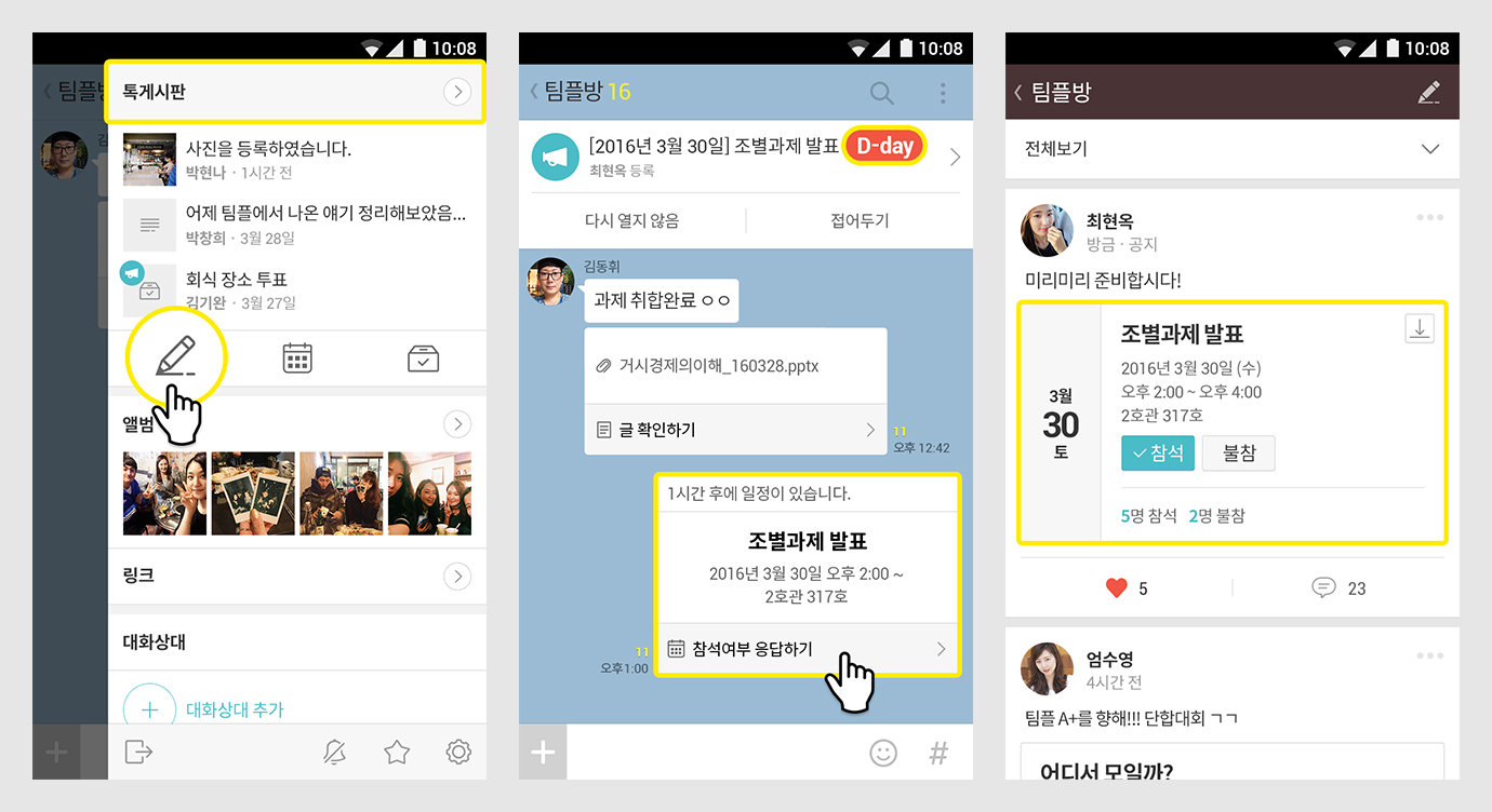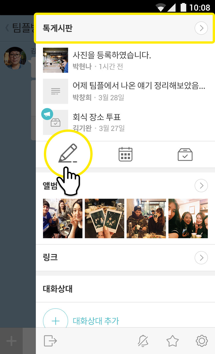 카카오톡 채팅방에 사진, 동영상, 파일 첨부가 가능한 톡게시판 기능이 추가된다. 이를 통해 카카오톡의 모임 관리 기능을 강화하고, 대화의 지속성과 편리성을 한층 더 높인다고 밝혔다.