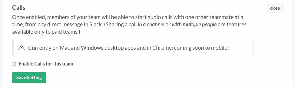 슬랙이 현재 제공하고 있는 보이스 콜은 모바일 단말에서는 제공되고 있지 않습니다. 윈도우용 클라이언트나 맥용 클라이언트 최신 버전, 그리고 웹 기반으로 슬랙을 이용하는 경우에 이 기능을 활성화하여 사용할 수 있습니다. 본격적으로 보이스 콜이 힘을 발휘하려면 모바일에 대한 지원이 되어야 할텐데요 이 부분들도 현재 로드맵에 잡혀 있기 때문에 조만간 메세징과 보이스를 아우르는 협업툴로 자리메김할 것 같습니다. 참고로 다중 사용자 통화는 유료로 슬랙을 쓰는 경우에만 사용할 수 있습니다.