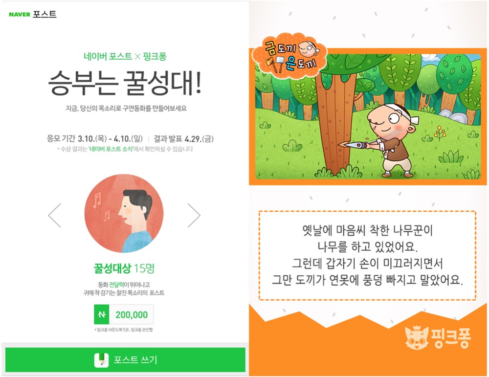좋은 구연동화를 녹음한 80명에게 핑크퐁 사운드북 5권 세트를 지급하고 이 중 우수작 30명에게는 네이버페이 20만원을 추가 지급한다.