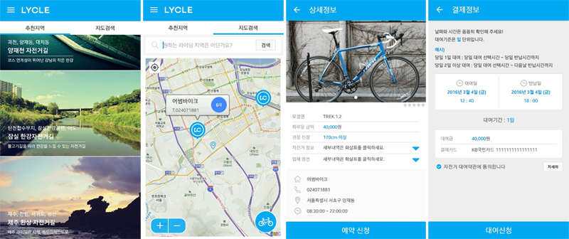 3월 21일 안드로이드 앱으로 출시하는 ‘라이클(LYCLE)‘은 자전거 대여 O2O 서비스이다. 위치별로 전국 자전거 업체를 검색하면 대여 가능한 자전거 정보가 나오고, 신용카드만 등록해놓으면 결제까지 가능하다. 특히 자전거 사진은 우리가 직접 사진을 찍어 올린 사진이라서 신뢰할 수 있다.