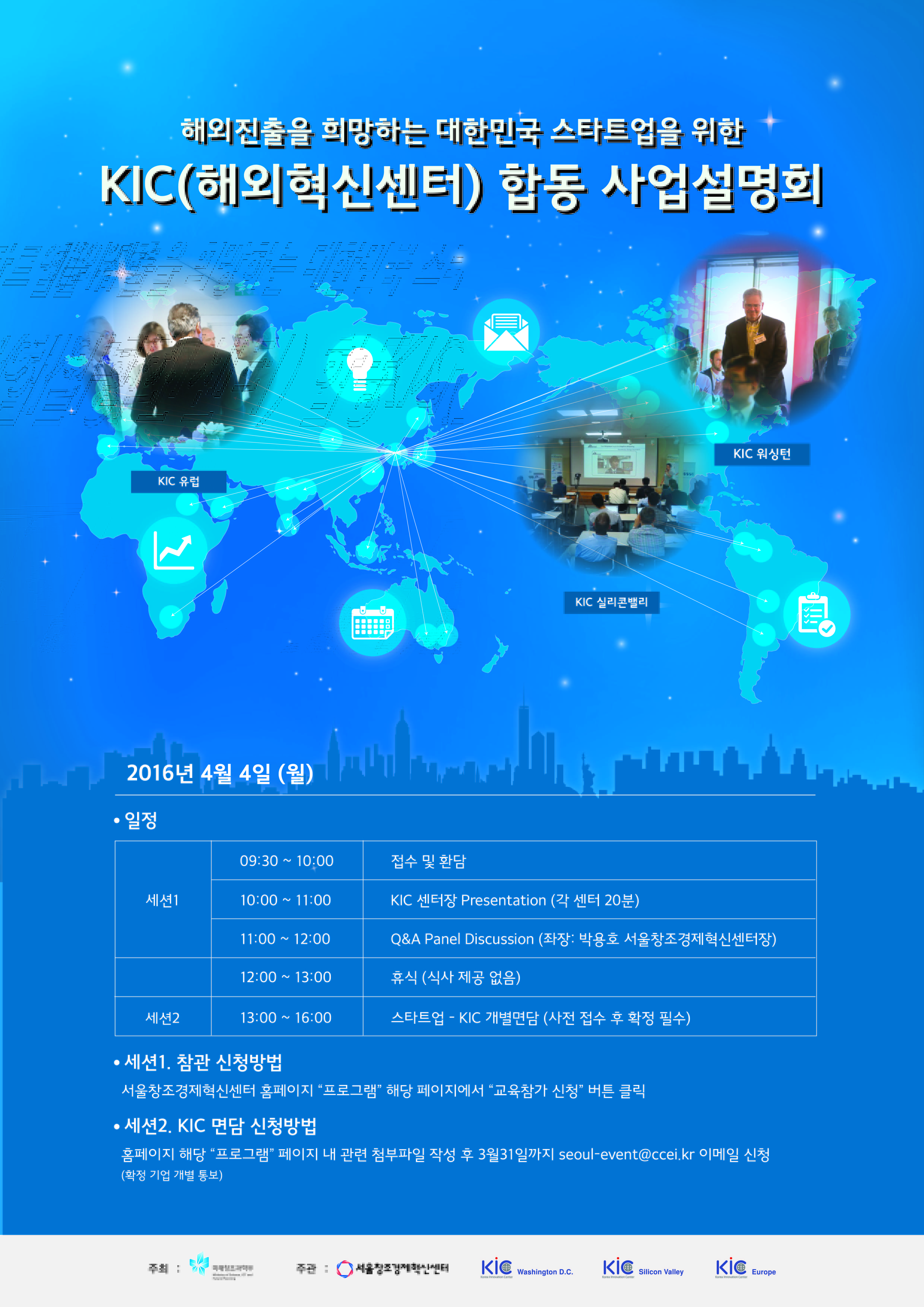 서울창조경제혁신센터는 KIC(해외혁신센터) 글로벌 진출 트렌드 교육을 4월 4일(월) 오전 9시 30분부터 서울창조경제혁신센터 컨퍼런스 홀에서 진행한다.