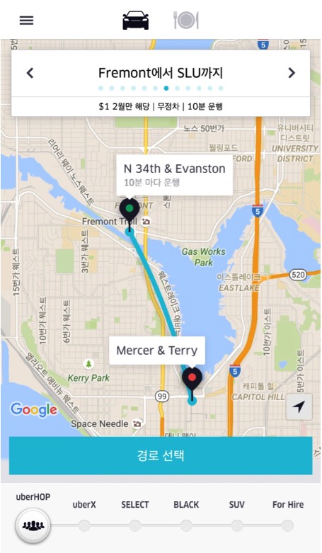 하지만 우버의 가능성은 그게 끝이 아니었다. 대중교통수단마저 대체해버릴 가능성이 보였다고 하면 과언일까. 우버는 시애틀에서 지난해 12월부터 우버홉(UberHop)이란 서비스를 시작했다. 시애틀외곽에서 시애틀시내로 출퇴근하는 수요가 높은 노선 12개를 정해서 카풀서비스를 운영하는 것이다. 정해진 장소에서 10분마다 차가 출발한다. 요금은 현재는 홍보기간이라 단 1불이다. (원래는 3~ 5불.) 택시를 타면 가볍게 수십불이 나올 구간을 승용차를 타고 단돈 1불에 출퇴근할 수 있게 된 것이다. 한국에서 논란이 되고 있는 콜버스가 이쪽에서는 이미 우버를 통해서 유연하게 실행되고 있다고 보면 된다.