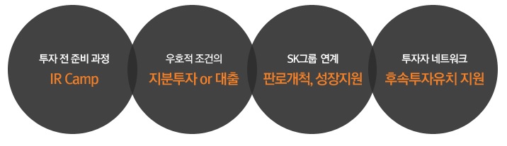 주요 지원내용으로는 크게 투자 유치 준비과정 참여 기회와 임팩트 투자 검토 기회 2가지를 제공한다. 투자 유치 준비 과정은 사회적 가치 측정, 경영 및 사업전략 수립, 투자 계획서 작성 및 투자자 대상 피칭, SK 사업 연계 검토, IR 기회 등이며, 임팩트 투자 검토는 기업의 필요에 따른 우호적 조건 투자, 사회적 가치 창출에 따른 우선주 배당률 감면 등의 인센티브 제공, 투자 후 기업 성장 지원, 후속투자 유치 지원, 은행권청년창업재단 디캠프 등 외부 파트너와 공통 투자 검토 및, 사무실 입주 추천 등이다.