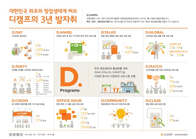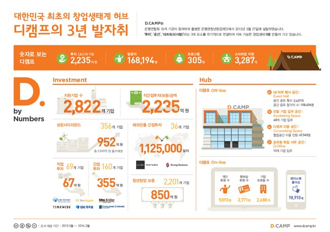 디캠프가 발표한 3년 성과 자료를 보면 지금까지 디캠프를 찾은 방문자는 약 17만명(누적)에 달했으며, 2,600여 건의 창업 관련 행사 및 프로그램을 진행했다. 보증을 포함한 직간접 투자 금액은 2,235억 원에 이르렀고 이를 통해 2,822개 기업을 지원했다.