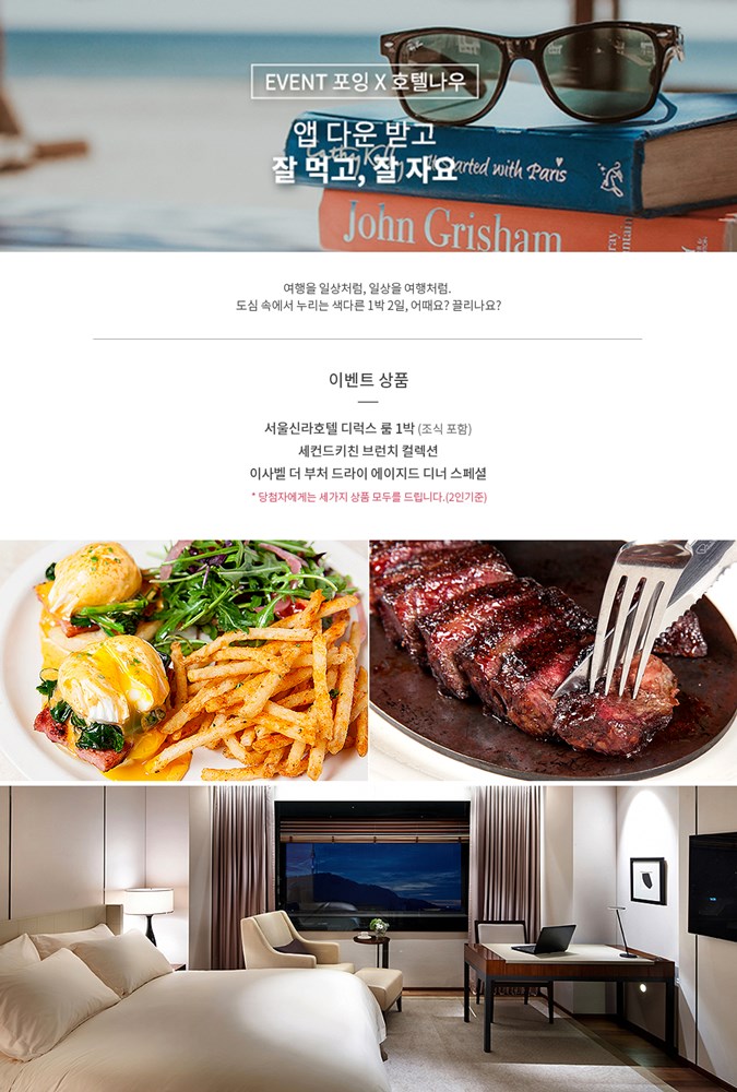 본 이벤트는 서울 신라 호텔 1박 숙박권과 ‘세컨드 키친’, ‘이사벨 더 부처 레스토랑’ 등 고급 레스토랑 식사권을 제공하며, 일상탈출을 꿈꾸는 이들을 위해 특별히 기획됐다. 이달 8일까지 이벤트가 진행되며, 포잉과 호텔나우 앱을 다운로드 및 가입 후 이벤트 페이지를 통해 응모할 수 있다.