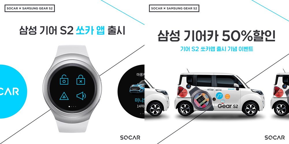 쏘카 x 삼성 기어 S2 랩핑카를 수도권 지역에서 100대 규모로 운영하며, 해당 차량을 예약하는 고객은 대여요금을 50% 할인받아 이용할 수 있다. 또한, 기어 S2 쏘카 앱을 다운로드 받은 후 로그인하는 사용자 전원에게 전 차종 1시간 무료 쿠폰을 제공할 예정이다. 이벤트는 오는 5월 13일까지 진행되며, 보다 자세한 사항은 쏘카 페이스북 페이지에서 확인할 수 있다.
