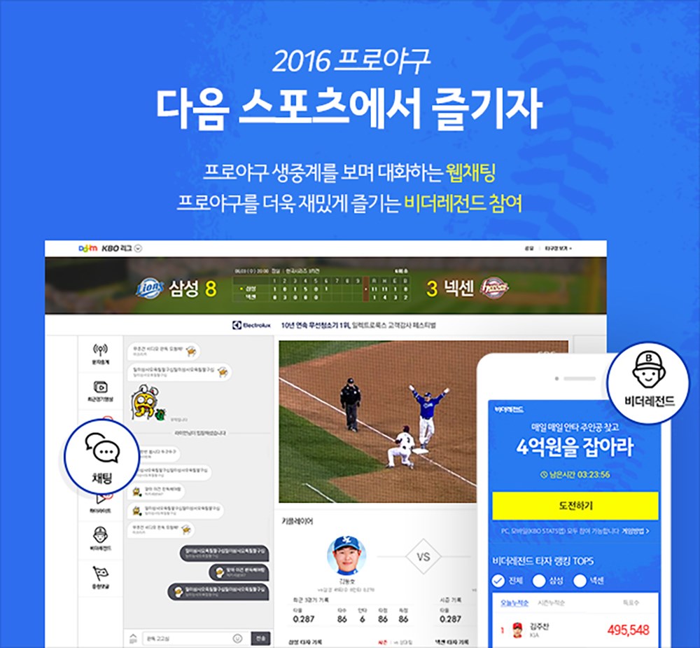 카카오가 올해부터 프로야구 시즌 전 경기를 다음스포츠의 야구 중계 플랫폼인 ‘KBO리그 게임센터‘를 비롯해 모바일 다음앱, 다음tv팟, 카카오TV, 카카오톡 채널탭 등 다양한 플랫폼에서 생중계한다.