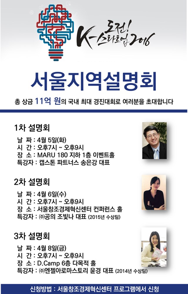 서울창조경제혁신센터는 도전! K-스타트업 2016 창조경제혁신센터 창업스타 서울지역설명회를 4월 5일부터 8일까지 3회에 걸쳐 개최한다. 본 설명회에서는 지난 대회의 왕중왕전 심사위원 및 수상자가 참가하여 경진대회 심사경험 공유 및 경진대회 준비에 대한 다양한 팁을 전달할 예정이다. 설명회는 총 3일간 매회 오후 7시에 진행된다.