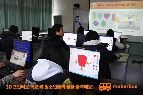 서울시교육청의 위탁형 대안학교인 한빛청소년대안센터와 메이커스가 카카오의 모금 플랫폼 ‘같이가치 with 카카오’를 통해 ‘학교 밖 청소년들에게 꿈을 찾아주기 위한 3D 프린팅 & 3D 디자인 체험 교실’ 캠페인을 진행한다고 4일 밝혔다. 이번 모금 캠페인은 청소년 보호 기관 10곳을 방문해서 다양한 이유로 인해 학교를 그만둔 학교 밖 청소년들에게 ‘3D 프린팅과 3D 디자인 체험 교실’을 통해 꿈과 재능을 찾을 수 있도록 도와주기 위해 시작되었다.