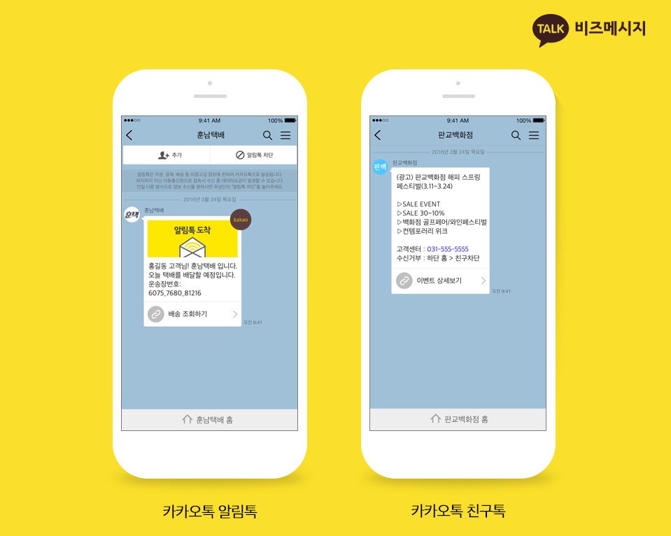 또한, 사전 친구등록 여부와 상관없이 정보성 메시지를 보내는 알림톡과 달리, 친구톡은 기업 고객이 운영하는 플러스친구 또는 옐로아이디와 친구를 맺은 이용자에게만 마케팅 메시지를 발송할 수 있다. 기업과 친구를 맺은 이용자 입장에서는 자신에게 더 맞춤화된 세일, 이벤트 정보를 받아 볼 수 있다.