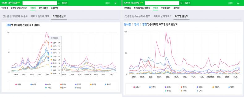 네이버는 지역별, 업종별로 이용자들의 관심도를 파악할 수 있는 ‘지역별 관심도’ 기능을, 빅데이터 포털 ‘DATA LAB’(이하 데이터 랩) 내에 추가했다고 22일 밝혔다.