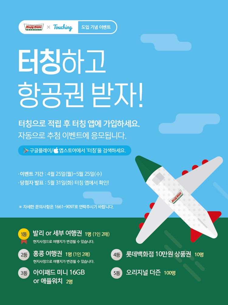 더불어 터칭 서비스 도입을 기념해 오는 25일부터 한 달간 크리스피크림도넛 매장에서 터칭으로 적립하는 고객을 대상으로 추첨을 통해 해외항공권, 롯데백화점 상품권 등 다양한 경품을 증정하는 이벤트를 진행한다.