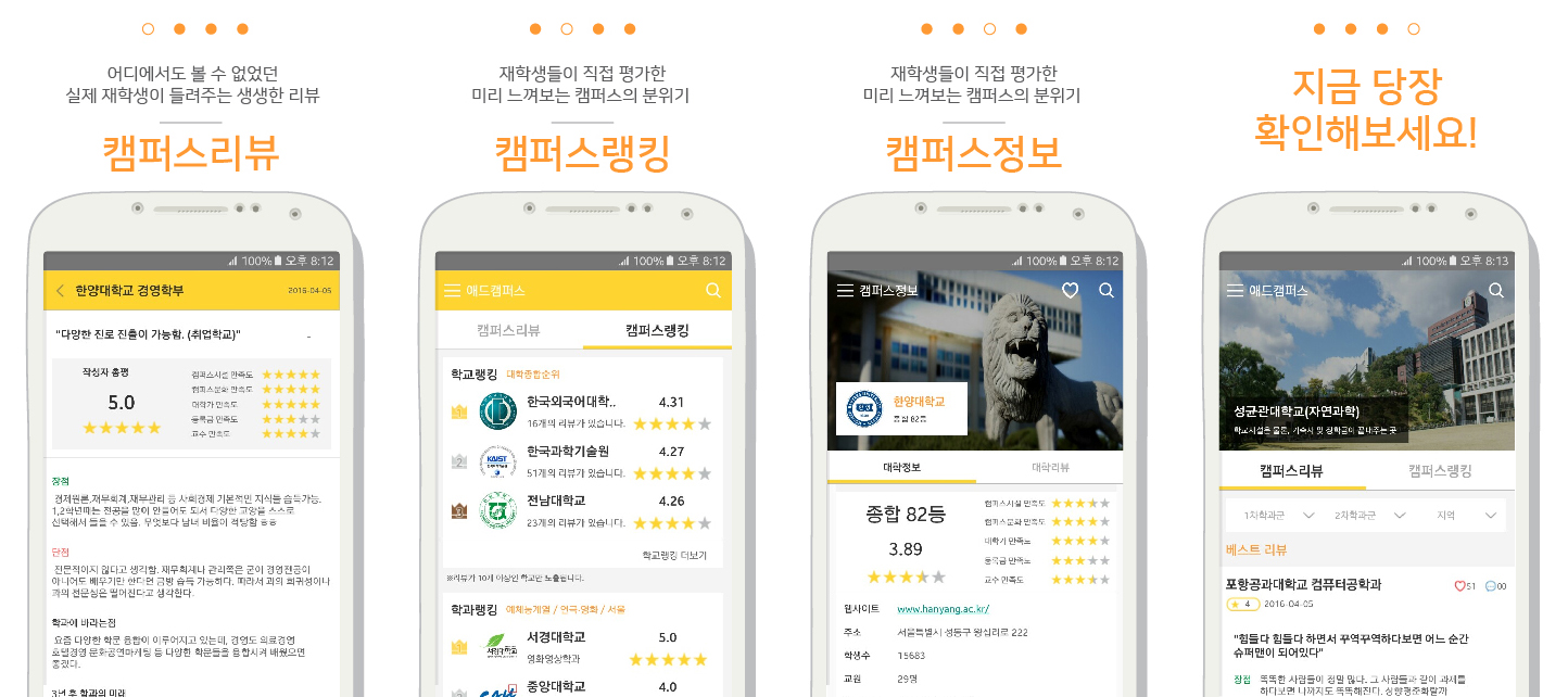 애드캠퍼스 2.0은 실제 재학생들이 남긴 리뷰에 대한 빅데이터 분석을 통한 대학 및 학과 평점 기능과 리뷰 맞춤제공 기능이 추가됐다.