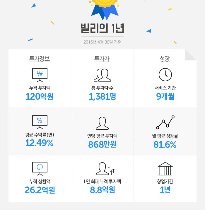 빌리에 따르면 서비스 오픈 9개월간 평균 이자율 연 12.49%, 부도율 0%, 누적 투자액 120억40만원, 누적 상환액 26억2,440만원을 기록했다.