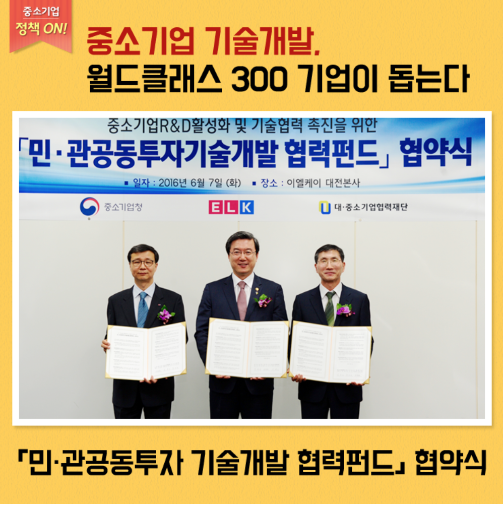 중소기업청과 이엘케이㈜는 6.7일(화) 대전 대덕구에 소재한 이엘케이㈜ 본사에서 50억원 규모의 ‘민‧관공동투자 기술개발 협력펀드’ 협약식을 가졌습니다.
