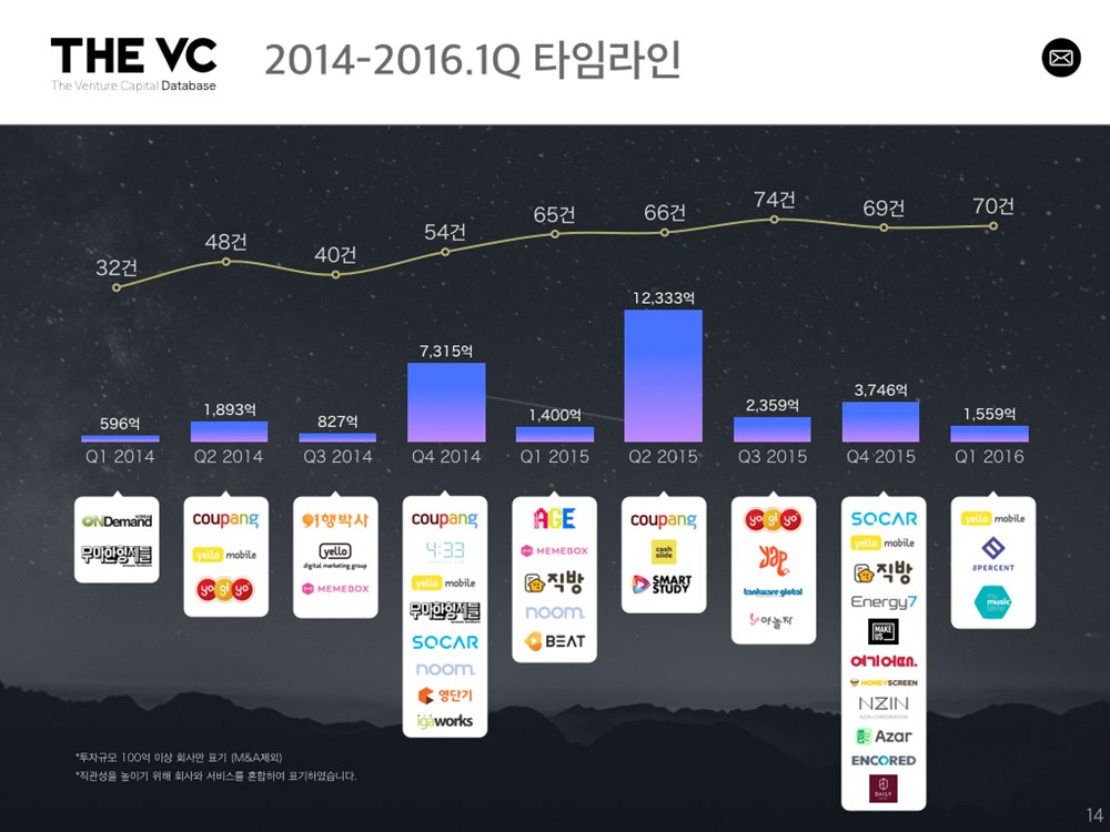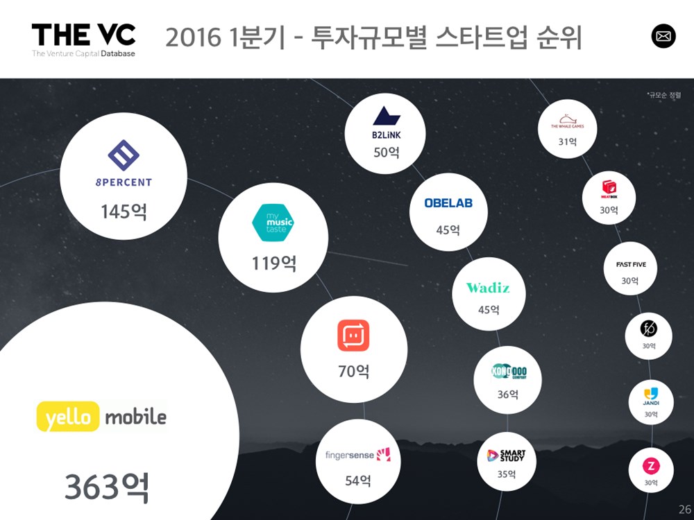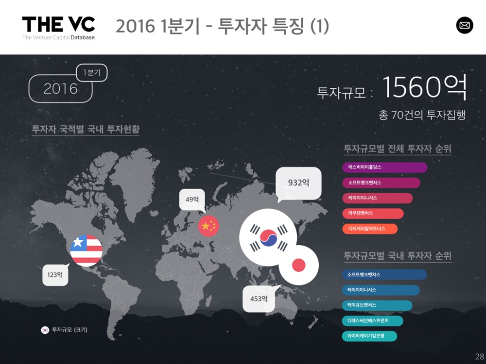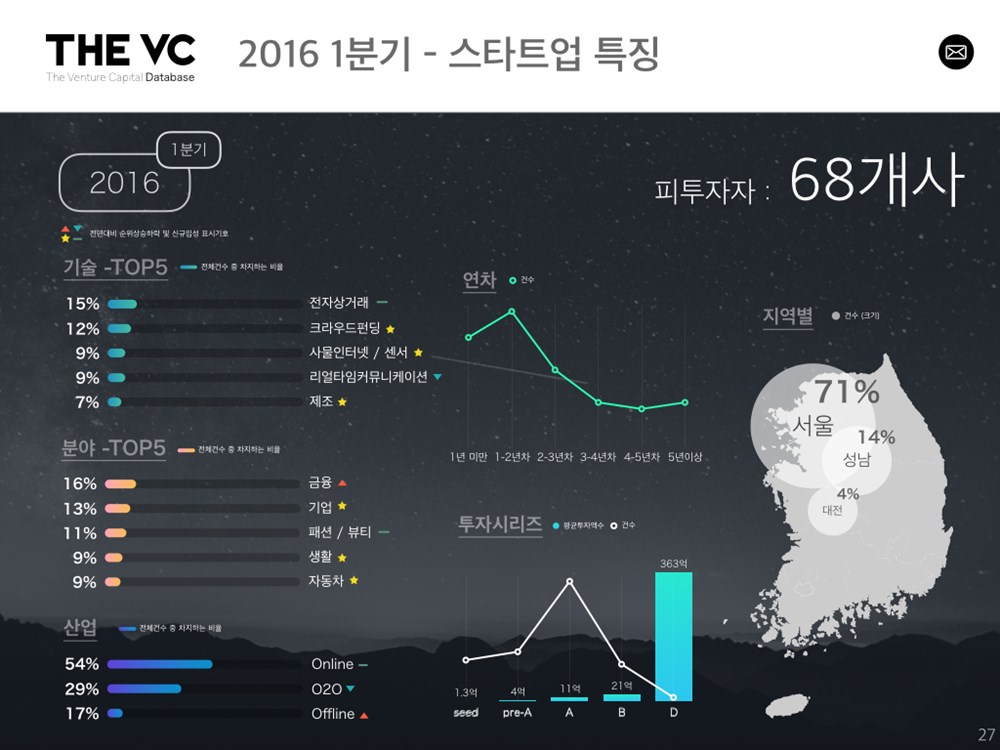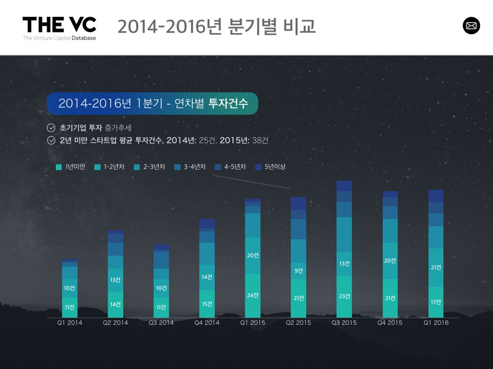 국내 스타트업 투자 생태계의 투명성을 높이기 위해, 투자 데이터베이스 서비스를 준비 중인 ‘더브이씨(THE VC)’가 2016년 1분기 스타트업 투자동향 자료를 발표했다.