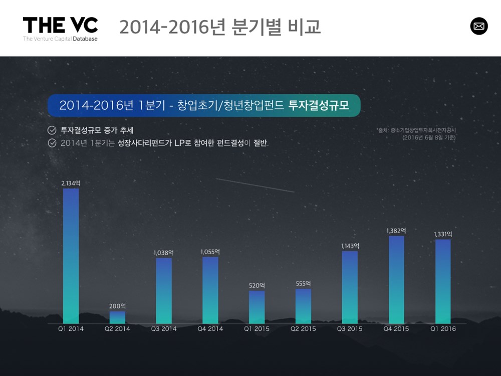 2016년 1분기에 결성된 한국 모태펀드의 자펀드 중, 지원 구분이 창업 초기/청년창업 펀드만 하여도 1331억 원 규모다. 한국 모태펀드가 초기 창업 투자에 힘을 쏟고 있는 것을 보여준다. 2014년 1분기를 제외하고 보면, 평균적으로 소폭 상승하고 있음을 알 수 있다.