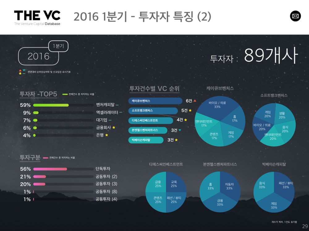 2016년 1분기에 투자한 89개사를 분석한 결과, 벤처캐피탈이 가장 큰 비중을 차지하고 있으며, 2위로 액셀러레이터가 올랐다. 액셀러레이터로는 3곳을 투자한 ‘프라이머’, 2곳을 투자한 ‘벤처스퀘어’ ‘매쉬업엔젤스’가 있었다. 대부분의 투자는 단독투자 56%와 2~3개사의 공동투자 42%로 나왔다.