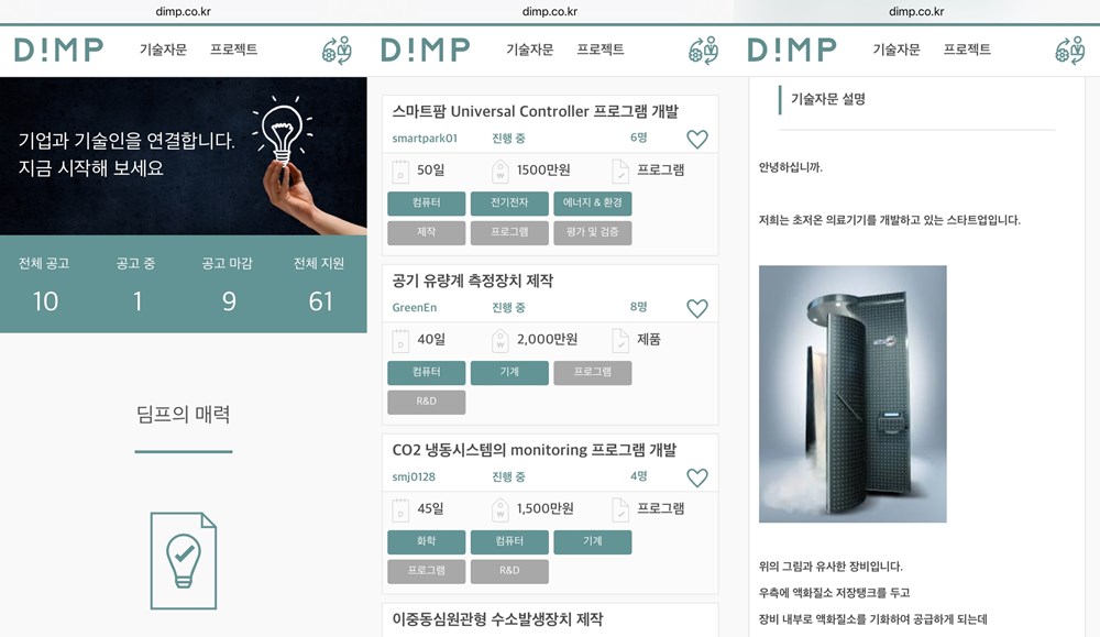한편, 딤프는 온라인 중개 플랫폼에 익숙하지 않은 고객과 기술 및 네트워크 확보에 어려움을 겪는 스타트업과 중소기업들을 위해 무료 상담 및 컨설팅을 제공하고 있다.