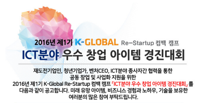 K-글로벌 리스타트 컴백 캠프가 2016년 첫 번째 ‘ICT분야 우수 창업 아이템 경진대회’를 개최한다. 재창업자를 위한 재기의 기회로 마련된 본 대회는 경영상의 어려움 등으로 폐업 후 다시 창업을 했거나, 재창업 예정인 창업자를 대상으로 진행된다.