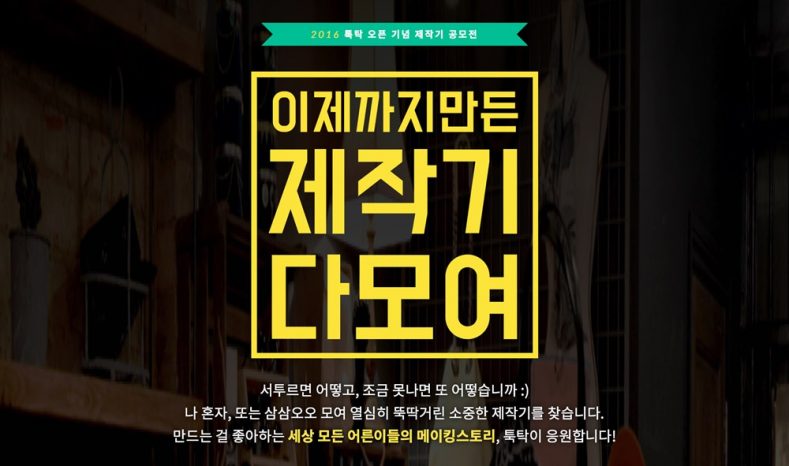 ‘툭탁 제작기 공모전’은 완성된 제품이 아닌 작품을 만드는 과정을 담은 제작기를 대상으로 열리는 공모전이다. 출품하는 작품 수에는 제한이 없다. 만드는 것에 관심이 있는 사람이라면 중학생 이상 개인과 단체 누구나 제작기 접수가 가능하다.