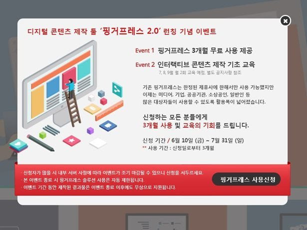 금번 이벤트는 핑거프레스를 3개월 동안 무료로 사용할 수 있는 이벤트다. 또한, 핑거프레스를 이용한 인터랙티브 콘텐츠 제작 기초 교육 서비스를 7월에서 9월까지 월 2회 제공한다.