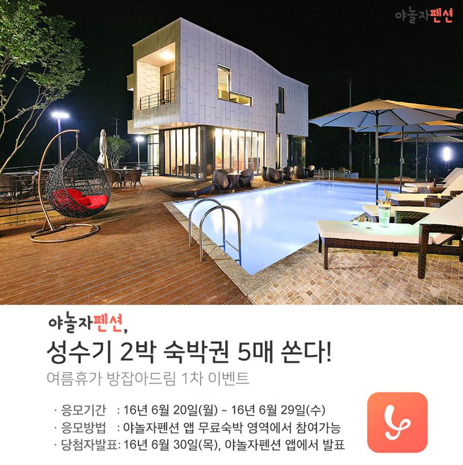 응모 기간은 6월 20일부터 29일까지이며, 당첨자는 5명으로 30일에 발표된다. 이 중 3명은 7월 29일부터, 2명은 7월 30일부터 각각 2박 3일 동안 야놀자가 특별히 엄선한 고급 펜션을 무료로 이용할 수 있다.