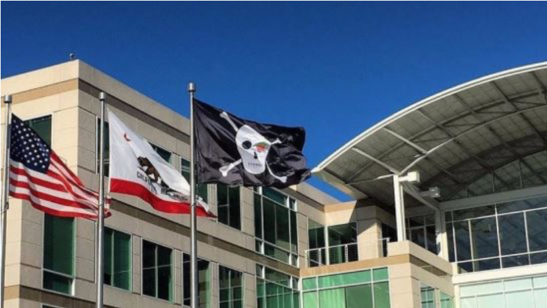 스티브잡스는 83년 오리지널 맥킨토시 개발을 주도하면서 “It’s better to be a pirate than join the navy” 라는 유명한 말을 남겼다. 직역하면 해군이 되느니, 해적이 되는 게 낫다는 뜻. 해군은 기존의 ‘고정관념’, ‘조직문화’, ‘관성’을 의미하고, 해적은 ‘새로운 창의력’과 ‘발상’을 의미한다고 할 수 있다. 완전히 새로운 것을 만들려면, 기존 고정관념과 관성에서 벗어나야 한다는 스티브 잡스의 정신이 해적팀으로 실행되었고, 이를 기르게 위해 해적깃발이 애플 40주년에 게양된 것이다.