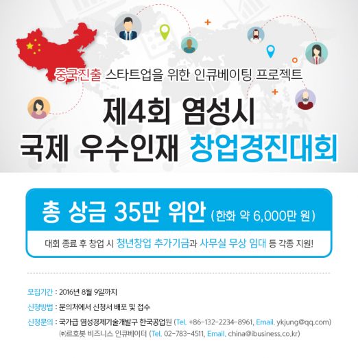 중국 강소성의 가장 큰 도시인 염성시에서 주최하는 이번 대회는, 중국 진출을 원하는 스타트업을 위한 인큐베이팅 프로그램이다. 국제 우수인재 창업경진대회는 우수 인재들을 염성시에 유치하고 과학기술의 혁신과 창업 생태계 형성을 위해 르호봇이 함께한다.