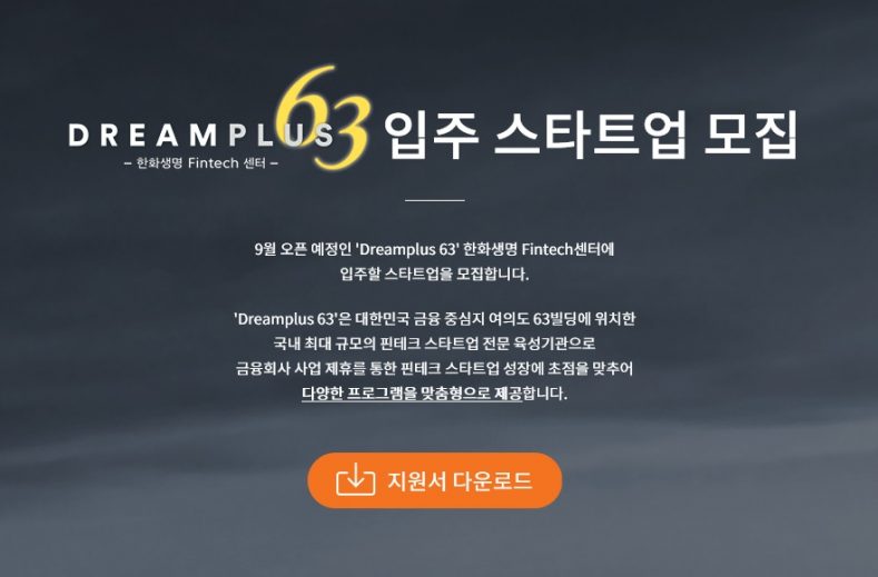 한화생명이 청년창업 지원 및 건강한 핀테크 생태계 육성을 위해 새로운 형태의 사회공헌활동에 나선다. 한화생명은 핀테크(Fintech) 육성센터인 ‘드림플러스 63(Dreamplus 63)’을 10월 중 63빌딩에 설립할 예정으로, 7월 31일(일)까지 참여할 핀테크 스타트업을 모집한다고 18일(월) 밝혔다.