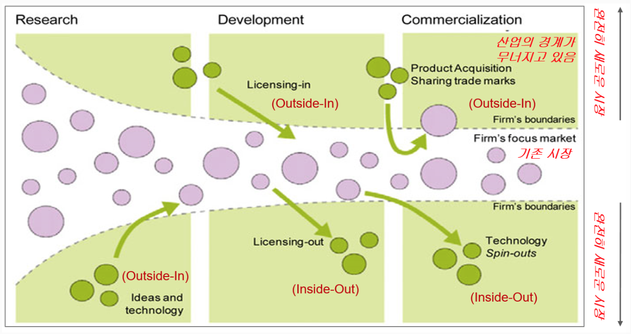 Open Innovation에서는 ‘Outside In’, ‘Inside Out’의 개념이 매우 중요하다. Outside In은 기업조직 내부의 역량으로 확보 불가능한 인재-기술-제품/서비스를 조직 내부로 끌고들어와 In-organic Growth를 달성코자 할 때 주로 활용된다. 크라우드 소싱(Crowd Sourcing), 전문가 그룹/집단/연구소/컨설팅 Firm과의 배타적 제휴나 협업, Acqui-Hire(기술인력 흡수를 목표로 아에 회사를 M&A하는 방법, 구글/페이스북/애플/아마존 등의 플랫폼 사업자들이 주로 활용하는 M&A전략) 등이 Outside-In의 대표적인 전략이다. Inside-Out은 내부 조직이 가진 핵심 기술 및 IP를 배타적 협업/제휴 기업에 거의 무상으로 Lisence-Out 하거나, 해당 기술조직부문을 아에 Spin-Out 또는 Spin-Off 시켜별도의 조직으로 외부에 셋입한 후, 완전히 새로운 시장을 개척할 때 활용된다. 이때 Venture Capital Fund도 개입하여 적극적으로 신시장 개척에 관여하기도 한다.