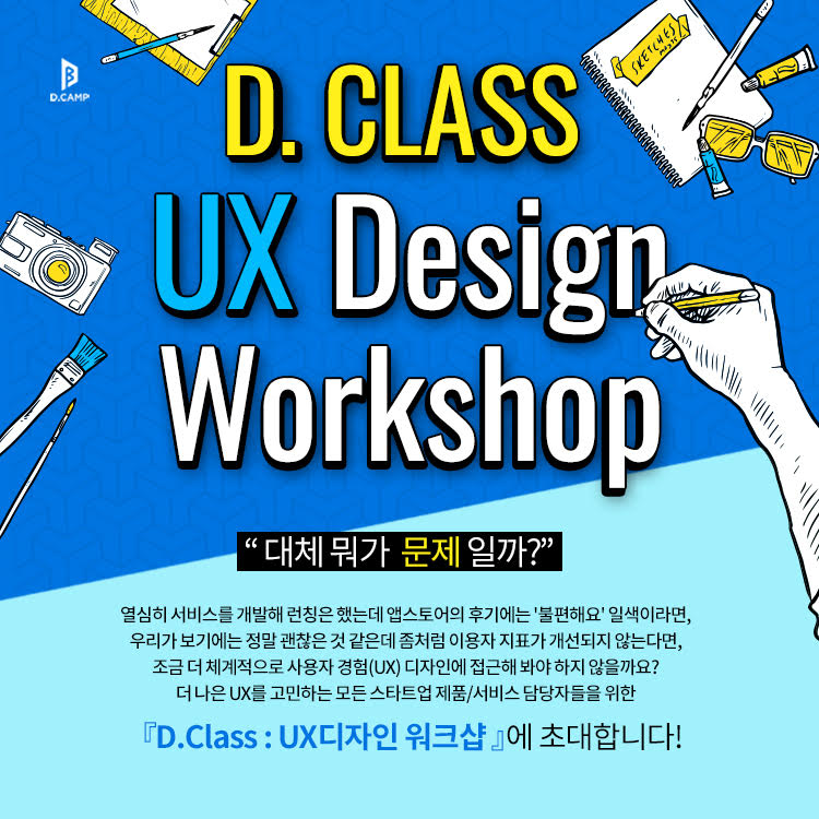 디캠프가 스타트업 실무자 대상 서비스 사용자경험(UX) 교육 ‘디클래스(D.CLASS) : UX 디자인 워크숍’을 16일부터 9월 9일까지 디캠프에서 진행한다.