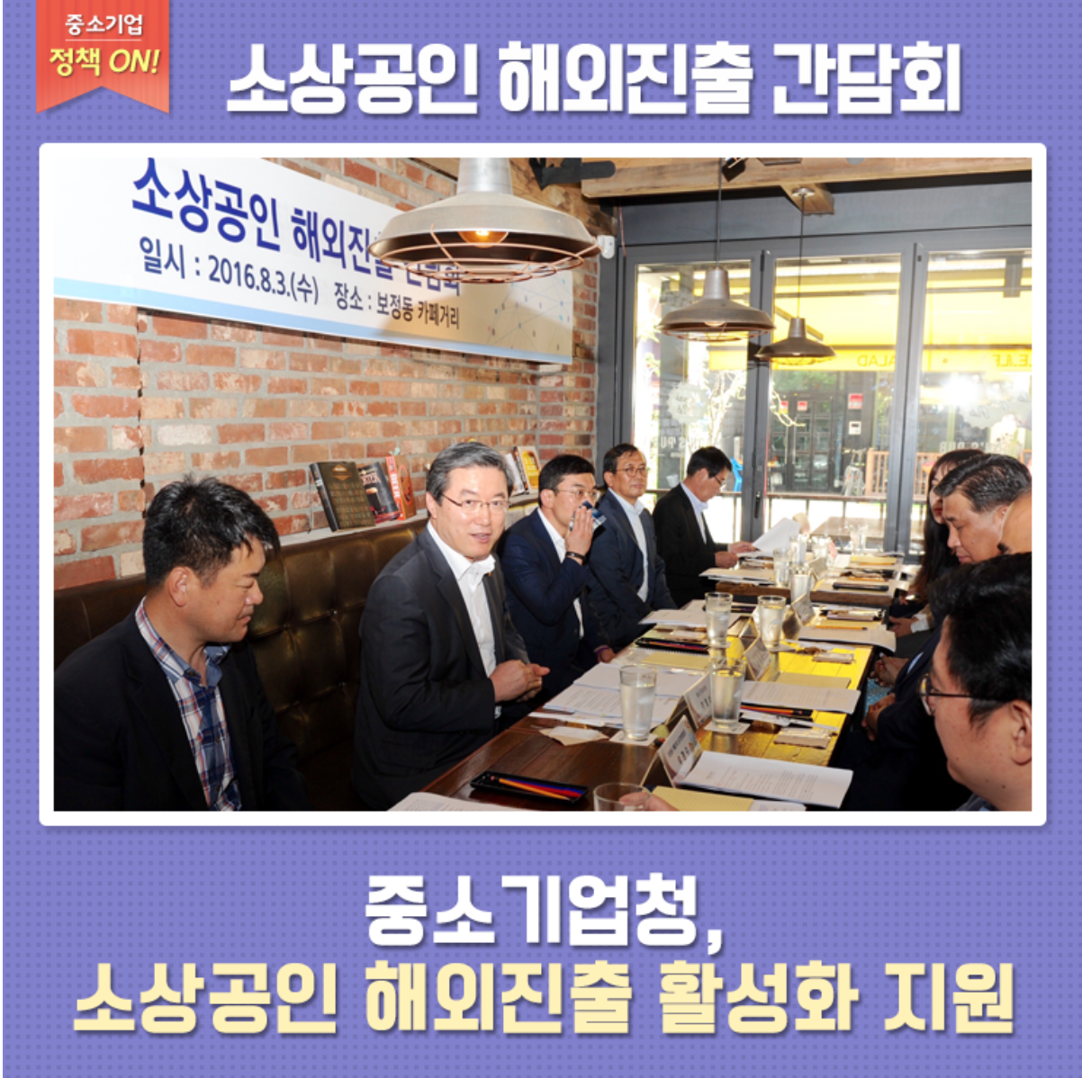 * 참석 : 중소기업청장, 보정동 카페거리 소상인, 소상공인협동조합, 수출 소상공인, 소상공인연합회장, ICSB KOREA 사무총장, 중소기업연구원장 등 16명
