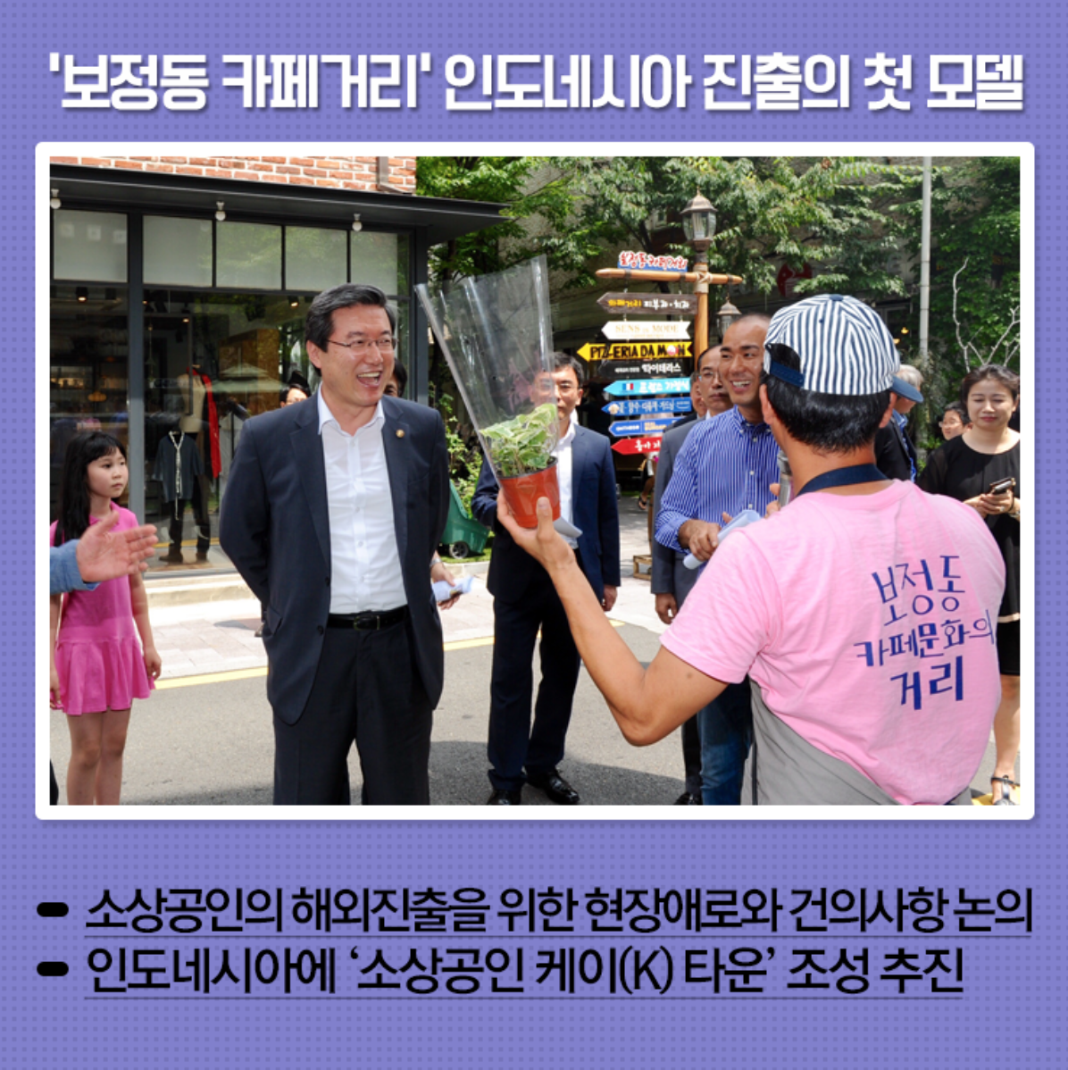 8월 3일 경기도 용인시 보정동 카페거리에서 열린 ‘소상공인 해외진출 간담회’에서 내년에는 인도네시아에 ‘소상공인 안테나숍’을 조성하고, 2018년말 경에는 자카르타 외곽지역에 ‘소상공인 K타운’을 조성하여, 케이 컬쳐(이하 K-culture) 등을 연계 운영하겠다고 밝혔습니다. 이를 통해 용인 보정동 카페거리나 홍대앞 거리처럼 현지 지역명소로 만들어 소상공인 글로벌화를 확산시켜 새로운 글로벌화 모델을 제시할 계획입니다.