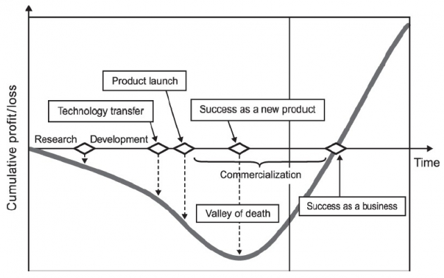그러나 필자는 국내에서 초기 기업(스타트업)이 설립되었을 때 실제로 실현 가능한 이론인가에 대한 질문만을 놓고 보자면 과연 현실적으로도 의미 있는 이론일까 하는 의문을 제기합니다. 솔직하게도 의미 있기 보단 이렇게 되었으면 하는 이상적 그림에 가까울 뿐이라고 생각이 드는 부분입니다. 여기에서 또 하나 우리가 이미 알고 있는 사실을 하나 더 살펴볼 수가 있는데요. 출발지점을 현금 흐름 시점이 아닌 제품 성장주기의 시점에서 보자면 다음과 같습니다. 바로 ‘죽음의 계곡’이죠.