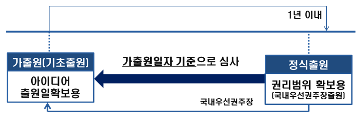 국내에서도 국내우선권주장제도를 이용하면 미국의 가출원 전략과 동일한전략을 쓸 수 있다. 즉, 아이디어 확보용 출원(즉, 기초출원)을 한 후, 1년 이내에 이를 기초로 하여 구체화된 내용을 보완하고 등록 가능한 수준으로 청구범위를 작성한 국내우선권주장출원을 하면 기초출원일자를 기준으로 등록가능성을 판단받을 수 있다.