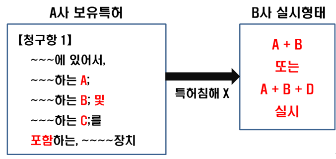 - 기존 특허의 조건(청구항)이 ‘~하는 A; ~하는 B; 및 ~하는 C를 포함하는 ~~ 장치’의 구조로 되어있다면, 이 중에서 A나 B나 C를 제외한 기술을 사용해 피해갈 수 있는 방법을 찾아라. 즉 A+B+C가 아니라 A+B, 혹은 A+B+D로 만들어라.