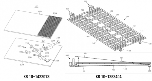 <표 1>의 3번, 4번 특허는 실제 필드와 유사한 상황을사용자에게 제공하기 위한 보조장치들에 대한 장치특허들이다. (그림 3) 가상골프 게임 내에서의 필드 경사도를 현실공간 상에 구현하여 줌에 따라, 사용자가 가상골프를 현실의 필드골프와 유사하게 느끼도록 해주는 보조장치들을 특허로 획득하였다.