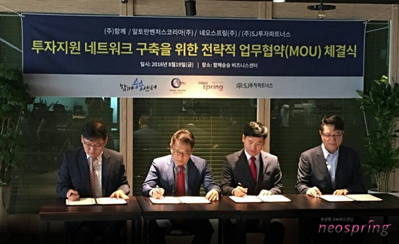 크라우드 펀딩 플랫폼 ‘네오스프링’은 액셀러레이터 ‘알토란벤처스코리아’, 벤처캐피탈 ‘SJ투자파트너스’, 인큐베이터 함께승승센터를 운영하는 ‘함께’와 투자지원네트워크 구축을 위한 전략적 업무협약(MOU)을 체결하였다고 8월 19일 밝혔다.