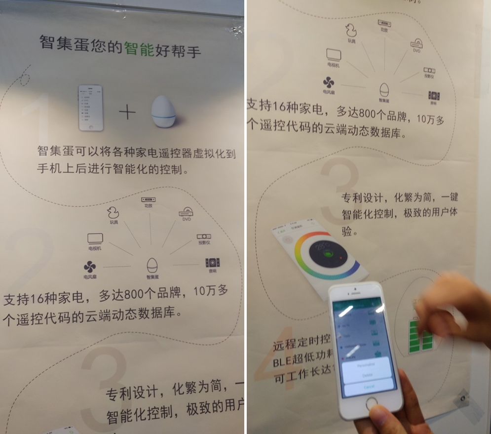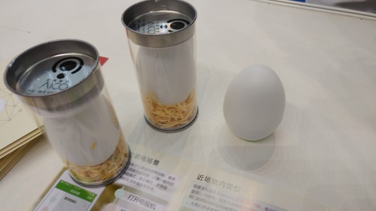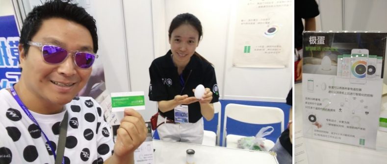 또한, 싱가포르에 본사가 있고, 쑤저우에 공장이 있는 중국 스타트업이 전시한 ‘스마트 에그’는 정말 충격적이었습니다. 온도 센서와 비콘칩만 있고, 그 외의 센서는 없는 초간단 ‘스마트에그’인 아래 제품은, 사실 스마트폰의 앱(리모콘 UI가 있음)에서 날아오는 제어 신호를 계란이 받아서, 집안의 각종 가전제품을 IR(적외선) 신호로 컨트롤해주는 방식의 놀라운 제품이었습니다. 판매가격은 99위안.