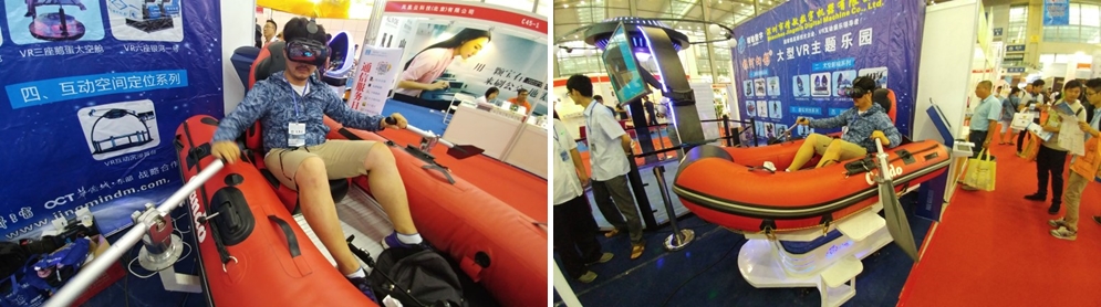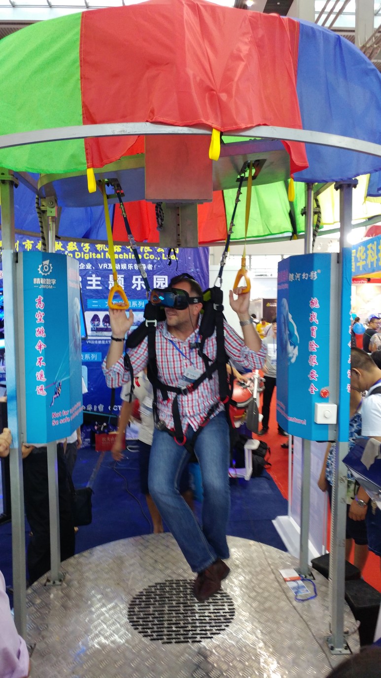 이번 전시회의 꽃은 뭐니뭐니해도 VR park 아이템이었습니다. 단순한 VR 디바이스보다는 오감을 자극하는 진동체들의 전시가 눈에 띄었습니다. 아래의 낙하산 VR 진동체의 경우, 실제로 낙하하는 VR 영상을 탑승자에게 보여주면서, 탑승자의 하네스를 조정하여 실질적인 낙하 기분을 제공하는 기구였습니다. 물론, 사람들은 낙하산을 탄 탑승자의 표정을 보면서 같이 즐거워했죠. ^^ VR park 비즈니스 모델의 핵심은 역시나 ‘줄 서서 기다리는 사람들의 공감’인 것 같습니다. 탑승자의 표정을 보고 있으면 정말 재밌어요. ㅎㅎ