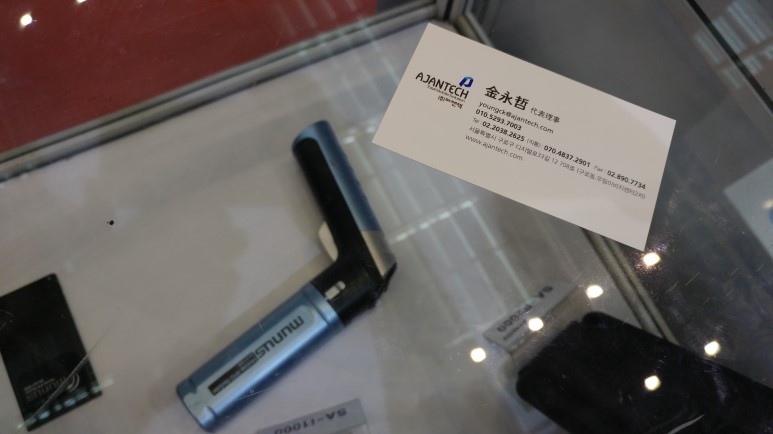 두 번째는 KOTRA 한국관에 입점한 RFID 회사인 AJANTECH 입니다. MANUS 라는 브랜드로 RFID 리더기를 전시하고 있었습니다. MANUS Gun은 RFID 안테나를 권총 형태로 구성하고, 스마트폰과 페어링 되어 RFID 정보를 폰에 바로 전송하는 혁신적인 제품이었습니다. 편향된 스캐닝 신호를 투사하여 최대 13m까지 원거리 RFID scanning이 가능하다고 합니다.