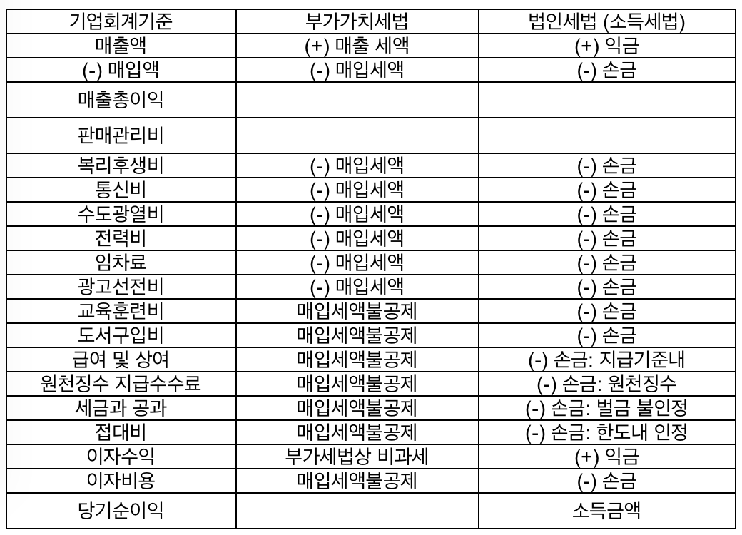위의 중소기업은 기업회계기준에 따라 재무상태표나 손익계산서 등 재무에 관한 여러 가지 표를 작성합니다. 재무제표 중 손익계산서와 부가가치세, 법인세의 관계를 전체적으로 본다면 아래의 표와 같습니다.