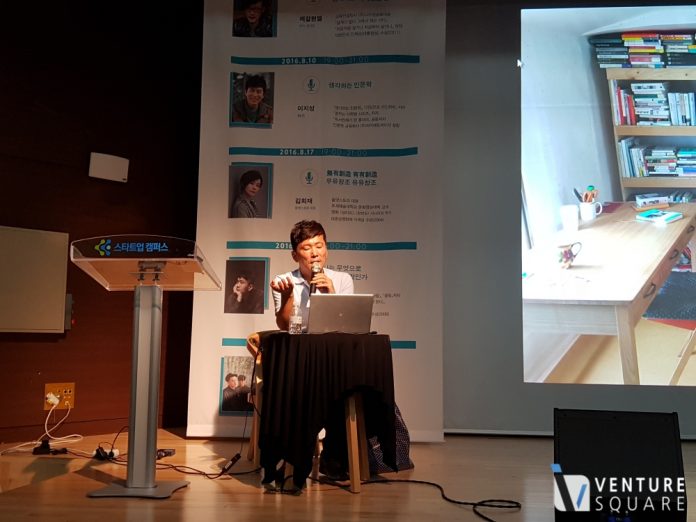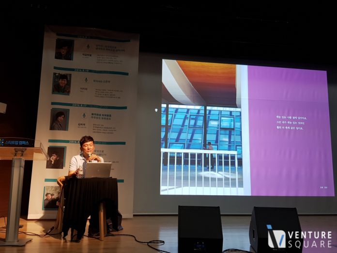 지난 24일 저녁 7시, 스타트업캠퍼스 1층 컨퍼런스홀에서 스타트업캠퍼스 주최의 인문교양 프로그램 ‘수요 인문학 콘서트’ 가 열렸다. 이날 행사에는 여행 에세이 <끌림>, 시집 <바람이 분다 당신이 좋다>의 저자인 시인 및 작가 이병률이 ‘나는 무엇으로 행복한 사람인가’를 주제로 강연을 진행했다.