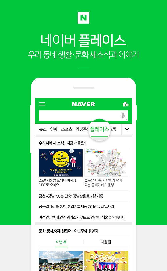 사용자는 네이버 모바일 메인화면 주제판 ‘플레이스’에서 동네 가게들의 숨겨진 이야기와 소소한 소식부터, 벼룩시장이나 동네 명소와 같은 알찬 소식, 공공기관에서 제공하는 문화 행사, 축제, 강좌 정보와 같은 생생한 소식까지 동네 터줏대감이 알려 줄법한 정보를 네이버 첫 화면에서 확인할 수 있다.