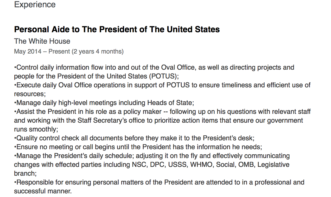 Ferial의 링크드인프로필을 보니 오마바비서가 된지 2년4개월째다. 자신이 무슨 업무를 하고 있는지 소상하게 밝혀놓았다. 매일 대통령에게 들어가고 나오는 정보를 관리하고, 대통령의 일정을 관리하는 업무다. 그야말로 대통령의 문고리를 잡고 있는 사람이다.